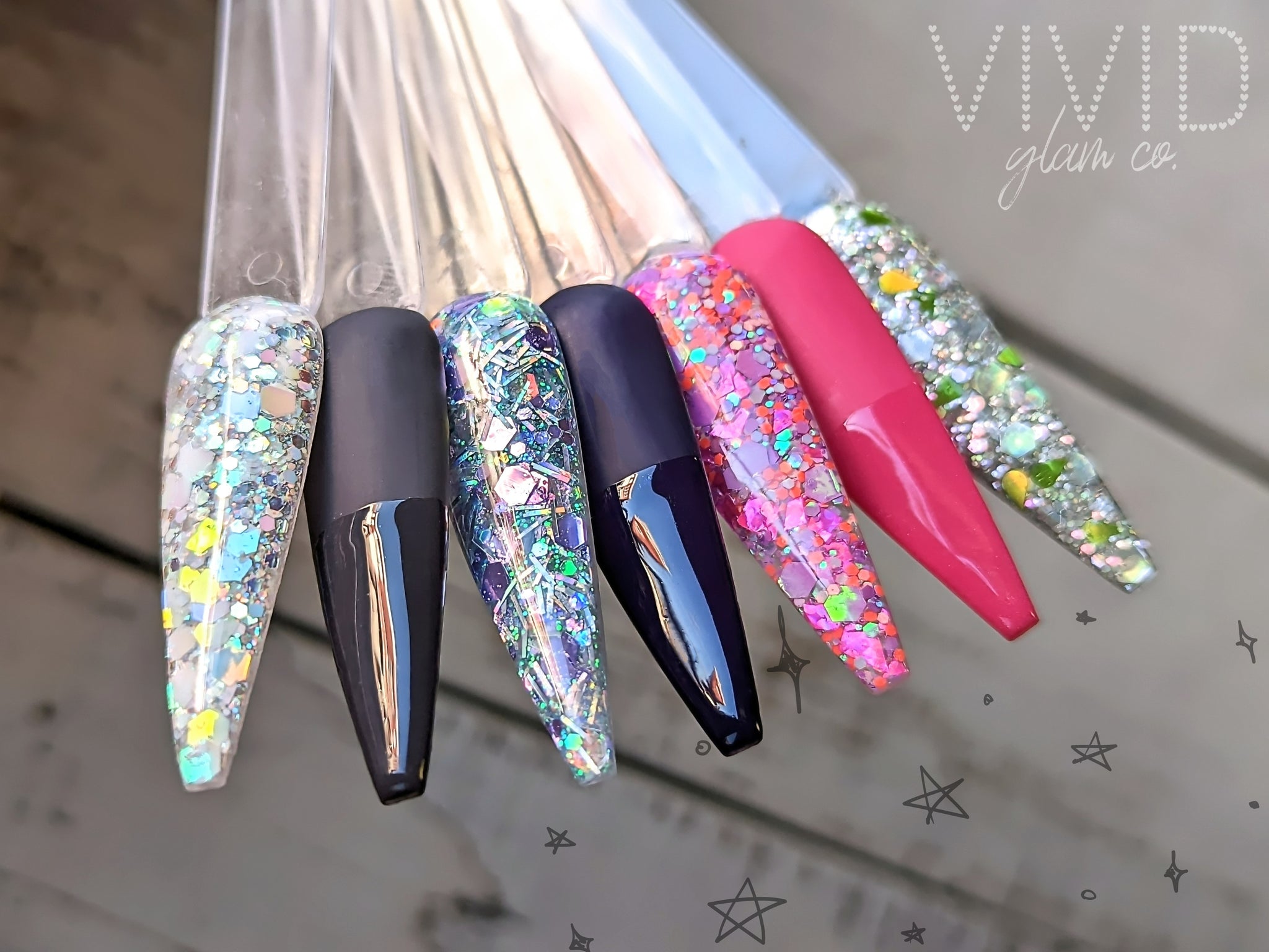 The Space Glam collection is truly celestial! Featuring unique glitter dip powders and otherworldly solid hues, you'll sparkle like the cosmos!