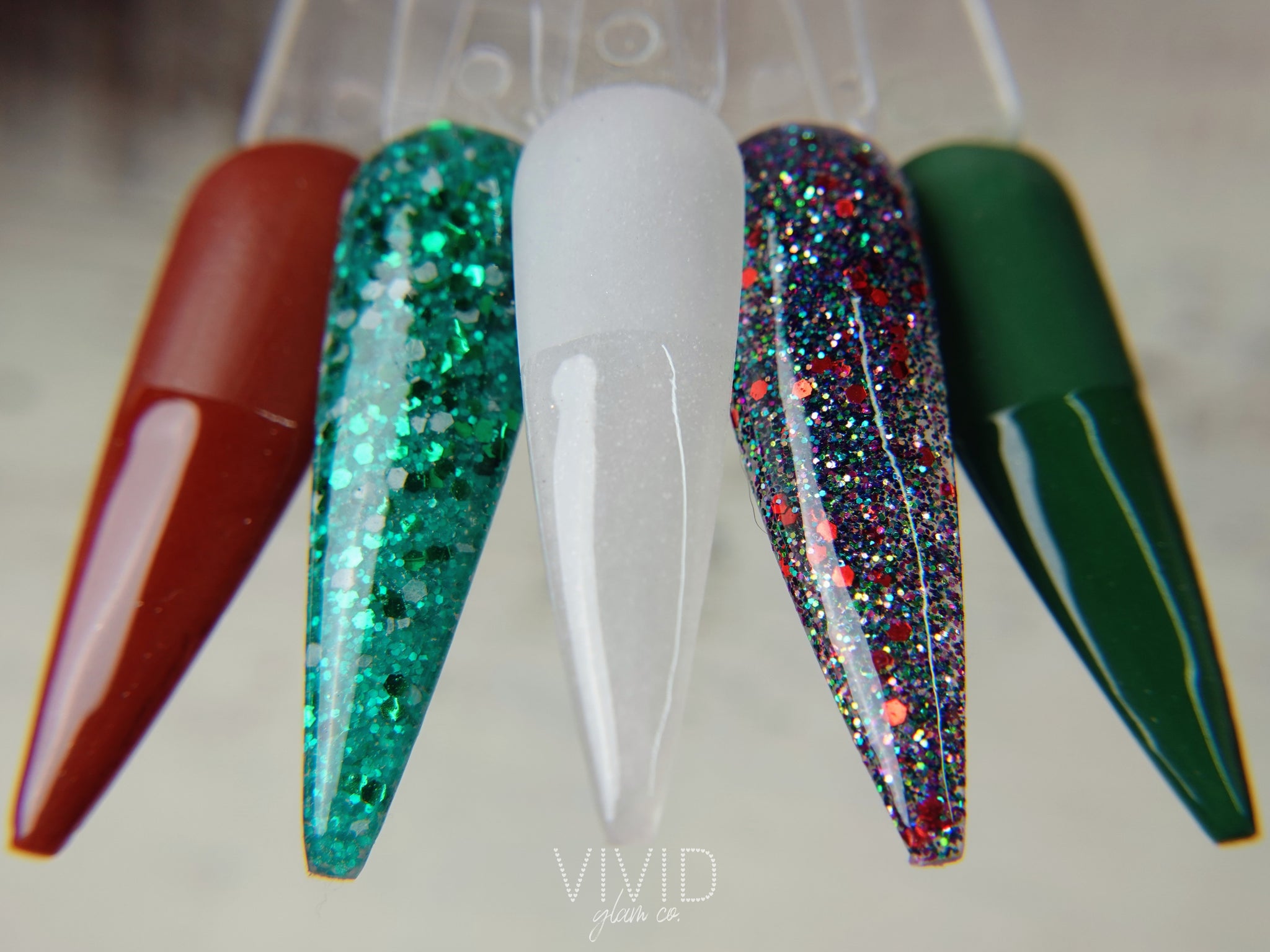 The Woodland Lights Collection is a forest-fairytale inspired dip powder collection featuring deep evergreens, frosted shimmer, twinkling multi-glitter, enchanted glow, and warm maple red. This palette is perfect for anyone who loves cozy, nature-inspired nails with a touch of magical sparkle.